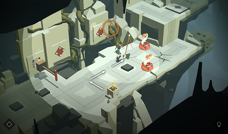 Welcome to the final chapter of the main story. Here we are introduced to another new mechanic inspired by classic Tomb Raider games: the timed door. Naturally this works a little differently in a turn-based setting, but the basic idea is the same. Start by climbing onto the ledge and moving to the right.