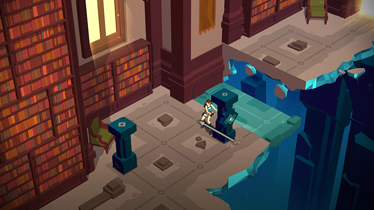 In the next area, step forward into the beam of light emanating from the first movable pillar. This activates the teal block trap on the ledge above the bookcases (not the gray block trap with the boulder).