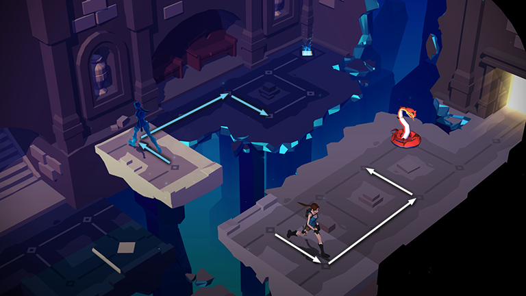 So start by moving to the right, then forward to kill the first snake on the right side of the room. Meanwhile, Spirit Lara moves left then forward, passing over the cracked floor in the left corner.