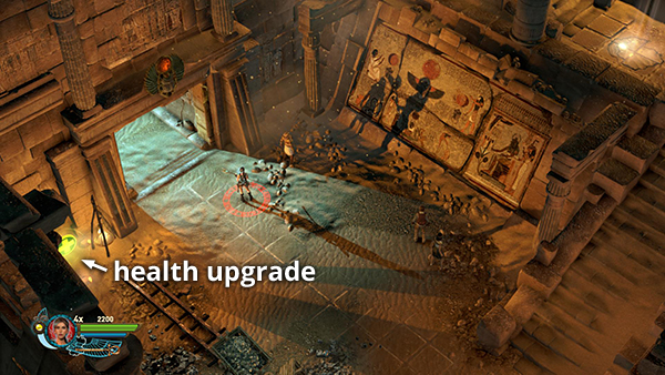 STARTING AREA: Smash the urns and pick up the MAX HEALTH UPGRADE hidden in the corner to the left of the entrance before heading up the stairs. (screenshot)
