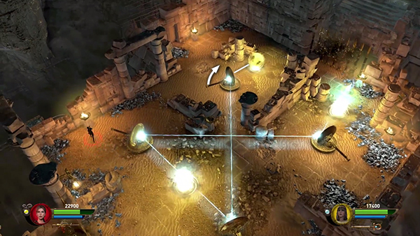 In the 2-player game there are 4 mirrors and 3 Marks of Set. Have Isis or Horus shine a beam while Lara arranges the mirrors. Start with the Egyptian character standing just to the right of the shimmering gate. Direct the beam through the nearest mark onto the mirror just beyond it. Then Lara can rotate that mirror so the beam crosses the room and strikes the mirror in the opposite corner. Lara can then run to that mirror and turn it so the beam reflects through Mark in the middle of the room onto the mirror in the lower corner. Lara can now go to the lower mirror and rotate it so the beam reflects diagonally across the room to the mirror in the top corner. After that, it's just a matter of turning that mirror clockwise slightly so the beam then passes through the third Mark. This completes the circuit and the Marks dissolve, opening the exit. (screenshot)