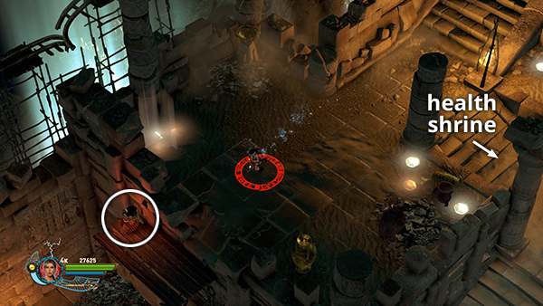 STAIRWAY WITH HEALTH SHRINE: Climb the scaffolding to a landing with a HEALTH SHRINE and some gems, as well as a few more braziers, urns, and breakable bits of floor. In co-op mode there is no scaffolding. Instead, use the shield-and-grapple routine to get everyone up. Go around to the left to get the red skull (3/5) you glimpsed earlier from below. (screenshot) Then continue to the top.