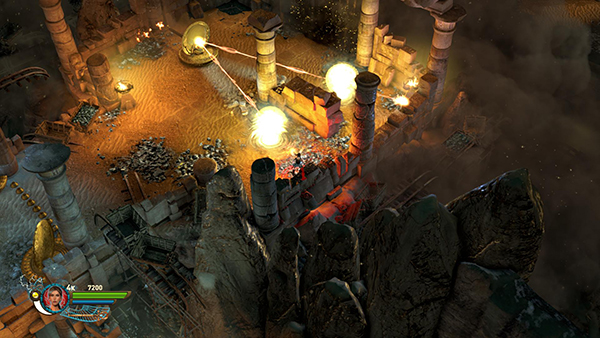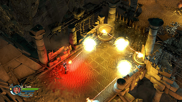SKELETON BATTLE AND FOURTH MIRROR PUZZLE: The gate closes behind you and you're trapped inside with a flaming skeleton warrior with a shield. More shielded skeletons and scarabs soon join the fight. The skeletons deflect most of your weapon fire with their shields, so you may want to run around, letting them chase you as you drop and detonate remote bombs in their path. The bombs damage the skeletons and also cause them to stumble temporarily, so they are vulnerable to guns or staff. In co-op mode one character can distract the skeletons while the other shoots them from behind. Just try to avoid the Marks of Set, since they will hurt you. There is more ammo in the middle of the room if you need it.