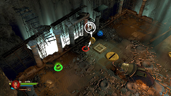 Don't forget to pick up the last red skull (5/5) before exiting. It is hovering near the left wall. In the single-player game, use one of the metal balls to reach it. In co-op just stand on one of the gods' shields. (screenshot) Then exit through the far gate to finish the level.