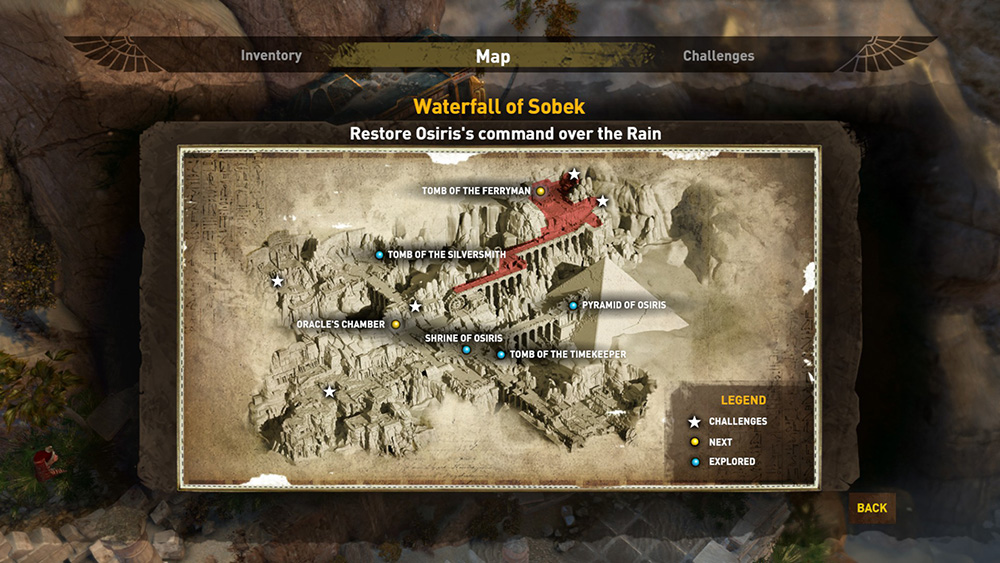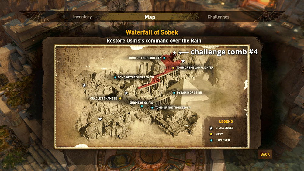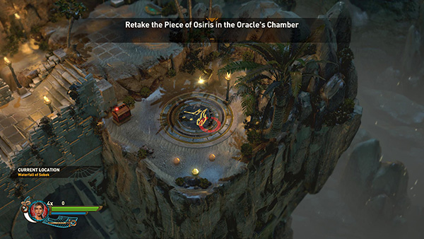 SECOND VISIT - AFTER TOMB OF THE FERRYMAN: As you emerge from the tomb, you receive a new Objective: Explore the Tomb of the Lamplighter Under the Waterfall. If you followed this walkthrough you also still have a separate goal from before: Retake the Piece of Osiris in the Oracle's Chamber. Both are marked on the Overworld map. (screenshot) It doesn't matter which you do first, but if you consult one of the Osiris statues, it will point you to the Tomb of the Lamplighter. Also, it's very close, so that's where we'll go next.