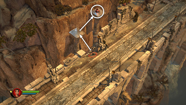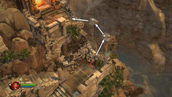 THIRD CHALLENGE TOMB: On the landing where the staircase turns back toward the west, there are 2 columns perched at the edge of the canyon. If you like, you can use them to hop up to the entrance to another challenge tomb. (screenshot) The THIRD CHALLENGE TOMB WALKTHROUGH is included on a separate page. You can explore it now or return later.