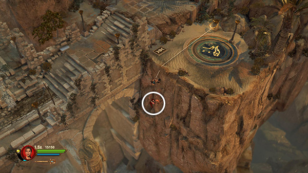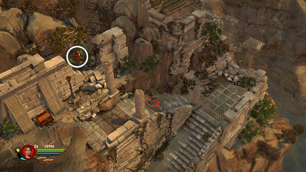 The next red skull (2/5) is ahead on the right. On the wide ledge with the round symbol, grapple the golden ring and rappel down the cliff to snag the skull. (screenshot) In the co-op game, have one character grapple another and lower him (or herself) down. Climb back up and continue up the stairs.