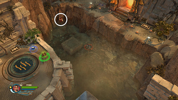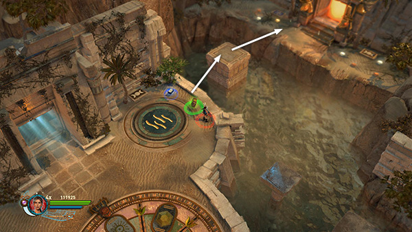 In the co-op game there are two gates across the aqueduct. Use the shield-and-grapple routine to climb onto the ledge before the first gate. Destroy the Mark of Set to bring down both gates. Then the Egyptians can use their shields for protection as they drop down and destroy the arrow traps. When it's safe, the other characters can use the bubble shield to reach the ledge with the pressure pad that opens the gate on the ledge where you destroyed the Mark. (screenshots)