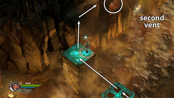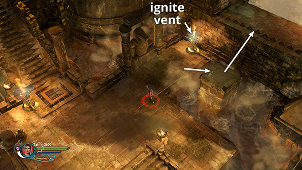 In all versions, once the gas vent in the left corner is lit, the puzzle is solved and the water in both pools begins to boil, causing a set of columns to rise in the pool above. If any of your characters are still on the lower level, wait for the flames on the middle gear to go out and then carefully grapple up onto the ledge, making sure not to touch the boiling water for the hot water challenge. Then use the columns to reach the wide corridor above. (screenshots)