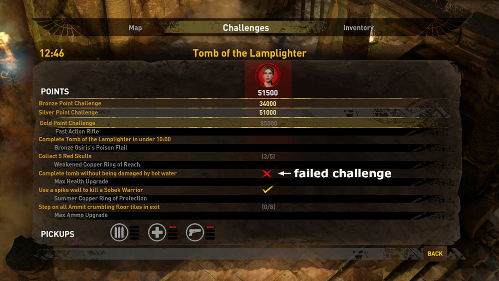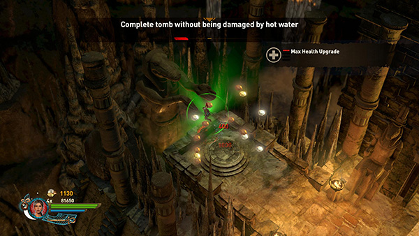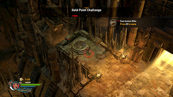 Just ahead is the level exit, but it is closed. Run forward and grab the bag of gems from the low pedestal to open the exit and add a few extra points to your total. If you beat the Challenge: Complete Tomb without Being Damaged by Hot Water, you will also get a MAX HEALTH UPGRADE when you pick up the gems. (screenshot) There are also a few braziers you can light and urns you can smash if you're a few gems short of the 85,000-point gold challenge. If you beat it, you'll unlock the FAST ACTION RIFLE. (screenshot)