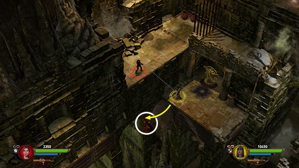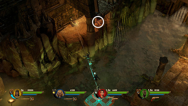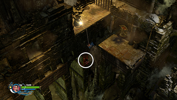 In 2-player co-op, the golden ring is directly above the spiked wall, so Lara will need to grapple it so Isis or Horus can tightrope walk up to the ledge, move over to the left, and then let Lara grapple him or her so she can climb up without getting skewered. Then the Egyptian can extend his or her shield so Lara can reach the red skull (1/5). Lara should then light the gas vent on the right to heat the pool below, raising another pillar and letting in the next 2 enemies. If you're still working on the spike wall challenge, refer to the tips in the single-player version, above. (screenshots)