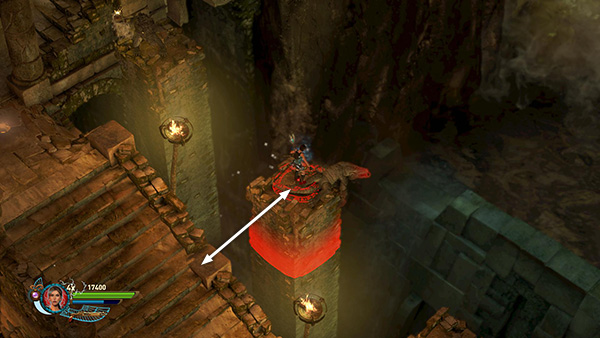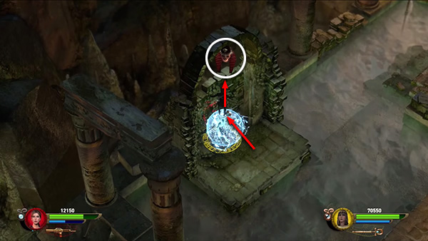 The next red skull (3/5) is sitting in an alcove high on the left. (screenshot) In the single-player game, you'll need to wait to get it. In co-op mode use the Staff of Osiris to raise a pillar in the pool. Then grapple the golden ring in the alcove so another character can tightrope walk across to the skull. (screenshot)