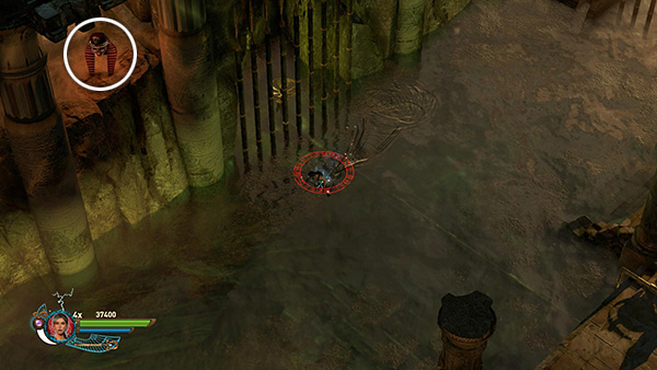 STARTING AREA: Smash the vases and light the braziers on the way downstairs. Stepping on the pressure pad at the bottom triggers a brief cutscene in which the a gas vent ignites, boiling the water in the nearby pool and killing an unsuspecting crocodile. Smash the remaining vases and light the braziers for gems. Shoot the crocodiles in the pool on the right. (You won't receive points for the kills if you boil them.)