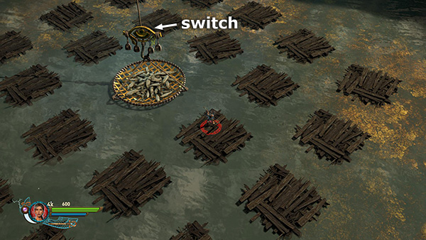 SOBEK BOSS FIGHT - PHASE ONE: When you first enter the cavern with the large pool and wooden rafts, there is a basket full of fish hanging from the ceiling. To see how it works, shoot the eye-shaped switch above the basket. (screenshot) This raises it out of the water. After a few moments, SOBEK breaches the surface and devours the fish, basket and all, before returning to the depths. (screenshot)