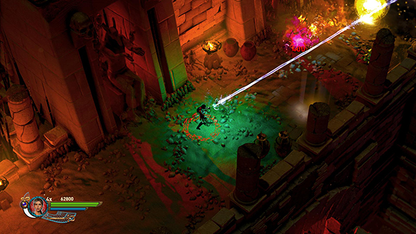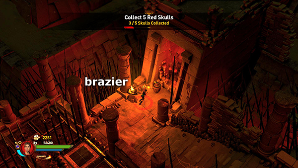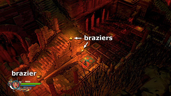 NOTE: In the walkthrough for the first level I attempted to note the location of every gem, breakable urn, etc. In later levels, I don't mention them all. So unless you're attempting a time challenge, stay alert. Try to kill every enemy, light every brazier, and break or blow up every destructible object, including vases, cracked floor tiles, sarcophagi, etc., for maximum score. I have, however, noted the locations of all the braziers for the challenge.