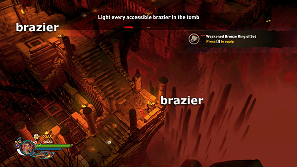STARTING AREA: As you enter the tomb, spikes pop up on either side of you, and the lights go out. You'll need to use torch and/or staff light to navigate. You can't reach the braziers behind the spikes so they do not count toward the Challenge: Light Every Accessible Brazier in the Tomb, but there are several other braziers in this area. Head down the stairs. There's a brazier (1/32) on the first crumbling ledge. Use your torch or an incendiary weapon to light it. Hop down to the lower ledge and jump across the gap on the left. Move around to the upper left to find another brazier (2/32) and a red skull (1/5). (screenshots)