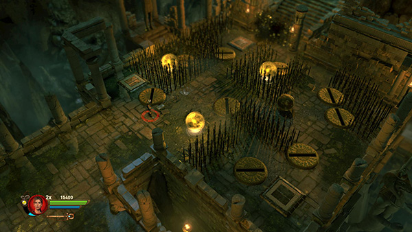 SINGLE-PLAYER CHALLENGE: Enter the tomb, smash some vases for gems, and scope out the puzzle. Amid various clusters of spikes there are 9 retracting mirrors and 3 pressure pads that control the mirrors. Each pad raises some mirrors and lowers others. In addition to Lara's weight, you have one metal ball to work with. (screenshot)