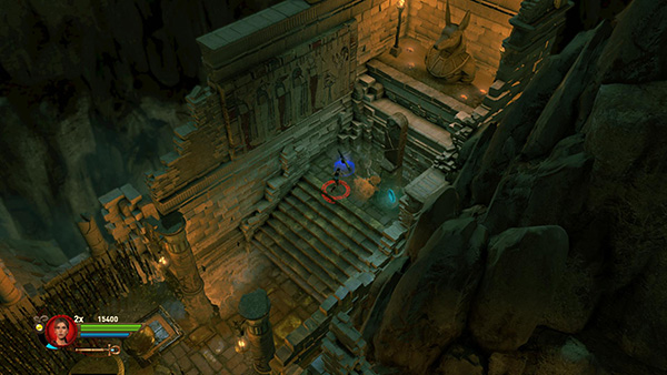 3- or 4-PLAYER CO-OP CHALLENGE: In this slightly more complicated version of the puzzle described above, the Mark of Set nearest the entrance is sitting on top of a pillar marked with Osiris's Glyphs. (screenshot) So in addition to arranging the mirrors correctly, one of the Egyptian gods must hold the staff aloft to keep the column retracted, while the other shines the beam of light to destroy the Marks.