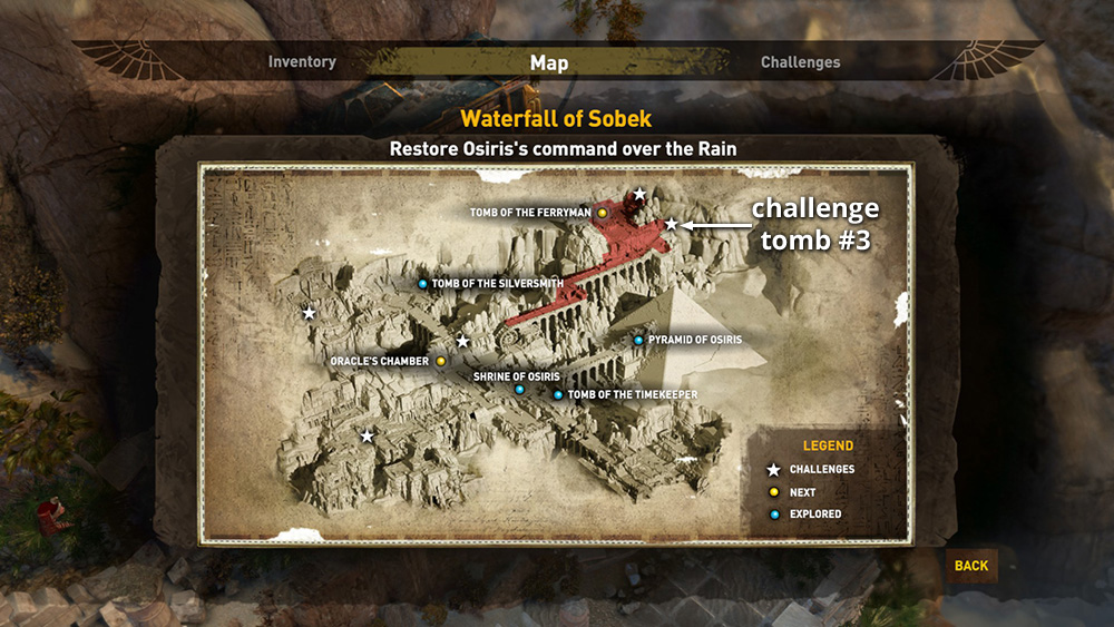 CHALLENGE TOMB ENTRANCE: The entrance to this Challenge Tomb is located in the northeast corner of the Waterfall of Sobek section of the Overworld. (screenshot) Its location is marked with a star on the Overworld map. (screenshot)