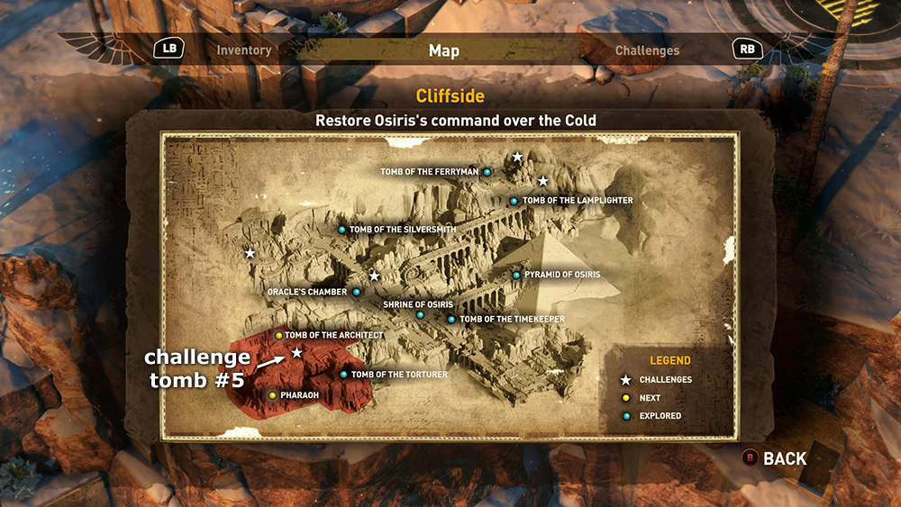CHALLENGE TOMB ENTRANCE: The entrance to this Challenge Tomb is located in the central part of the Cliffside area of the Overworld. (screenshot) The tomb's location is marked with a star on the Overworld map. (screenshot)