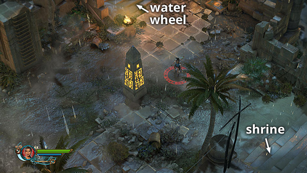 COMBAT CHALLENGES are another type of optional battle. They can be undertaken solo or in a co-op game. To attempt a Combat Challenge, approach any of the small obelisks with glowing, yellow runes. These are located in various locations throughout the Overworld: the Khepri Amphitheater (screenshot); Shrine of Osiris (screenshot); Waterfall of Sobek, though only during cold weather (screenshot); Cliffside (screenshot); and Sunken Chapel of Sobek. (screenshot)