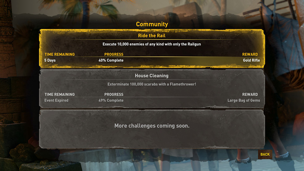 COMMUNITY CHALLENGES reward players for working together. Each week a new challenge is introduced in the Community section of the game's main menu. (screenshot) An example of a recent challenge is shown here. (screenshot)