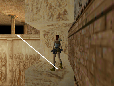USING THE CORNER BUG TO GET THE UNREACHABLE LARGE MEDIPACK: There are many seemingly unreachable places in the various Tomb Raider games. One particularly enticing one is the light stone structure with the large medi pack in the ROOM WITH SQUARE PILLARS AND FIVE SWITCHES. To get there, you can use a technique that players call the "Corner Bug" or "Jump Trick." (Jeff Reid brought this to my attention, but I believe the corner bug was a known quantity before it was applied to this particular spot in the game.)