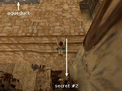 Swim back through the tunnel and return to the north end of the aqueduct where you entered this area. Safety drop down into the hole with the small medi pack, shotgun shells and Uzi clips. This is SECRET #2. (This screenshot shows the spot.) If you didn't kill the gorilla from above, do it now by jumping up and down until you get a pistol lock on it, then continuing to jump and fire until it's dead. Then take a standing jump out of the hole.