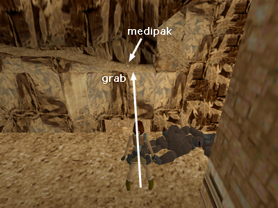 (The following sequence is shown in this set of screenshots and in this short video walkthrough.) Take a standing jump from the switch platform to the tall, square pillar to the left of the switches. From there, take a running jump over to the middle ledge of the light stone structure. Turn so Lara is facing the light stone block and the open room is on her right. Sidestep to the right until her right foot is at the edge. Then turn about 45 degrees to the right so Lara is facing the switch platform. Jump straight up and down in place repeatedly and Lara will creep forward toward the corner of the block. If you've positioned her correctly, after a couple of jumps, you'll notice her left shoulder and foot start to merge into the block. Keep jumping. Then, at a certain critical point, she'll suddenly pop up to the top of the block above, right next to the medi pack. Why? As Lara creeps forward, the game program interprets her position as being INSIDE the block. It knows this can't be true, so it "corrects" by repositioning her on top of the block. This is obviously a bug in the game, but apparently the programmers meant it to be exploited, or they wouldn't have put goodies up there.