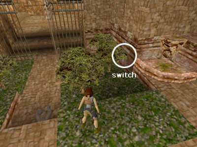 If you're patient, you should be able to kill 2 lions and 2 gorillas from the roof before climbing down. If you don't want to wait for the gorillas to show, you can dangle from the roof to draw them near, or drop down then jump on the rocks at the side of the temple to kill them from safety. When all is clear, approach the temple door, pick up the large medi pack and enter (the door opens automatically). Follow the passageway to a switch and use it to open the gate to a garden near the pool at the entrance. (PS1 players will find another save crystal here.)
