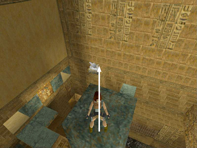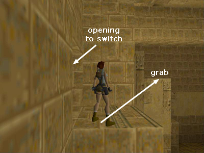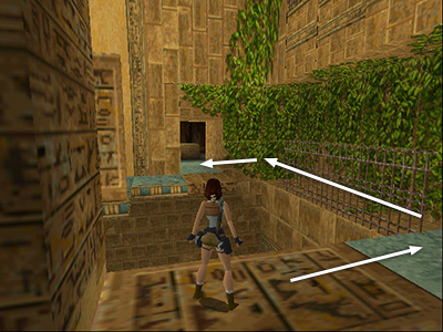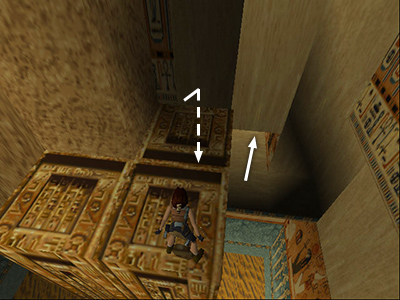 Climb onto the corner block, then the next higher ledge. Take a running jump to the large, square ledge ahead. Take another running jump to grab the block at the top right of the stone steps and pull up. (Console players will find a save crystal here.) Walk down one step and pull up onto the ledge at the doorway. This will awaken a mummy at the top of the stairs.