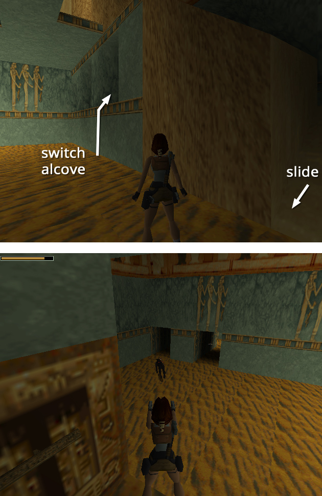 Halfway up the stairs you'll find a large medi pack. At the top is another switch. Use this to change the second (middle-level) slide in the previous room into steps, but don't return there yet. First, turn around so the switch is behind Lara and then hop down onto the ledge ahead. Go through the (north) door opposite the SCARAB. (This bridge is still up.)