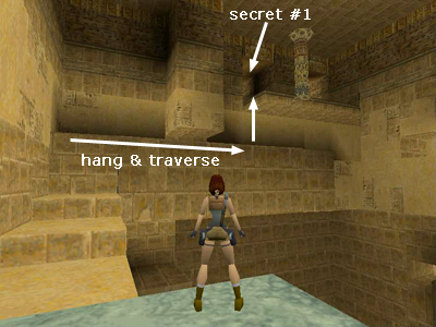 If you don't use the shortcut, go through the gold door next to the switch to emerge in the room at the top of the WIDE STAIRS, where you killed a mummy earlier. Descend the stairs, turn right onto the greenery-covered ledge (near the ANKH BRIDGE SWITCH, which you should have used earlier) and walk forward past the three painted columns. Here you'll find a ledge that juts out toward the square column with the artifacts. You'll need to take a running jump to reach the top of it. Walk to the edge and use the Look key to help set up the jump. When you hop back you won't be able to see where you're going because the camera will shift to behind the pillar, but trust Lara to get it right. (This screenshot shows the correct starting point.) Take a running jump, without pressing Action to grab, and you'll just make it. This is SECRET #2, the prize a small medi pack and Uzi clips.
