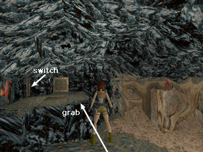 Roll, run past the exit door and jump at the edge to land on the low ramp ahead. Then climb onto the low block at the top of the ramp. (Or, after throwing the switch, roll and run off the platform, slide down to the ground, run forward to the side of the block and vault onto it, avoiding the ramp altogether.) Jump onto the tall pillar. Now take a running jump to grab the platform and run to the middle. The flesh creature should then run to the middle on her side and fall into the lava pit. When she does, the exit door near the pit will open. Drop down to the floor, climb back up the gray rocks to the other platform and go through the door.