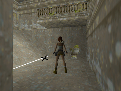 Stand underneath the balcony with Lara's back toward the slope. Step back to make sure she's as close to the base of the slope as possible. (The correct spot to stand is marked with an X in the screenshot above. The camera angle prevented me from getting a good shot with Lara actually standing there.)