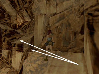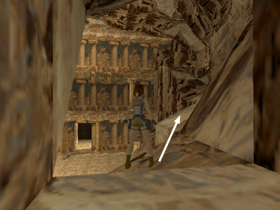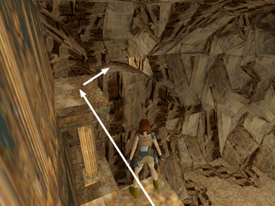 Now you should see a square flat block just ahead and below, a steeply angled block ahead and to the right, and beyond that, a little farther to the right, another flat spot. Take a running jump over the corner of the steeply angled block to the flat block beyond (as indicated by the arrow in the screenshot above).