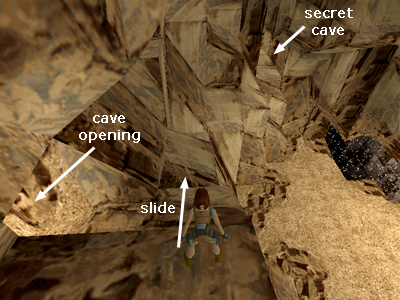 With the building behind Lara on the right and the pool ahead on the right, you can spot a well-lit cave opening below on the left. You'll be going here in a moment, but first the secret. Look straight ahead and a little to the right beyond the jumble of rocks. That rectangular cave opening on the far wall is where you're headed. Slide down the rocks ahead and walk forward to along the two flat blocks ahead.