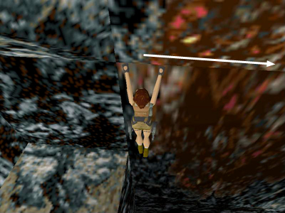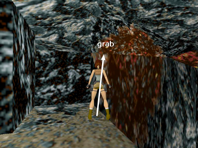 Turn left, so the lava pool is on Lara's right and walk forward until Lara touches the wall. Take one hop back, then sidestep as far as possible to the right so Lara's right foot is at the edge of the pit. Now turn about 10 degrees to the right so Lara is facing the wall just above and to the right of the edge, as shown in the screenshot above. Take a standing jump to grab the horizontal seam in the wall.