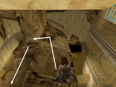 Walk out to the opening above the main area. Jump to the L-shaped stone ledge on the left. Go to the far end and take a running jump to the slightly sloped stone ledge beyond.