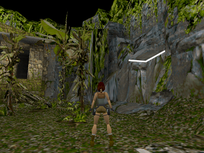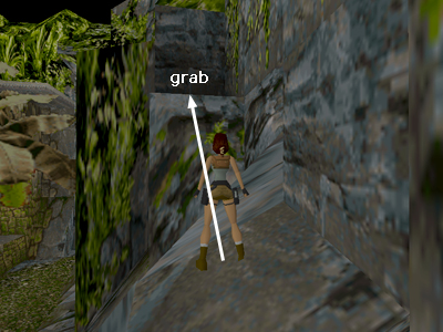 Once on top of this rock, turn left and position Lara near the middle of the block, a step or so back from the edge of the next block, which juts upward. (If Lara's feet are right against this edge, she won't be able to jump forward.) Then take a standing jump forward to grab the edge of the higher block ahead. Pull up.