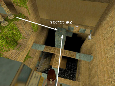 This shortcut leads directly from the HIGHEST ROOM—the one with the switch that lowers the SEAL OF ANUBIS bridge—to secret #2, on top of the column at the center of the drawbridges. It's a bit tricky, and Lara will lose about 3/4 of her health, so be sure to have full health and save your game first.