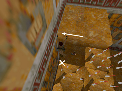 Drop back and hang from the edge of the ledge. Traverse until Lara is right next to the wall. Let go and she should land safely between the spikes on the spot marked with an X. Pick up the magnum clips, which count as secret #2.