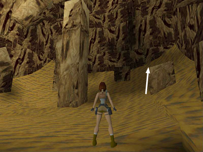 Take a running jump to the next low block up the slope near the cave wall. Pull up onto the ledge above. (It's hard to see in the screenshot above, so I have outlined it in white.)