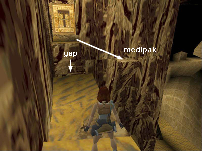 Walk forward and turn right. Advance slowly as there is a metal jaw trap just around the corner. Carefully run or jump through it, pick up the small medi pack and follow the ledge around to the right toward the switch. (Or, to avoid the blade trap, take a running jump from the jutting ledge to the path. Go left to get the medi pack, then turn around and head toward the switch.)