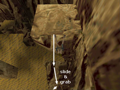 Hang from the far edge of that ledge (so Lara's back is toward the sphinx). Drop and slide down the sloping rocks to the ground, pressing and releasing Action as Lara slides to break her fall.