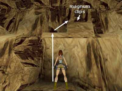 Turn left to face the cave wall. Climb onto the ledge ahead and above, then to the block on the right, where you'll find more magnum clips.