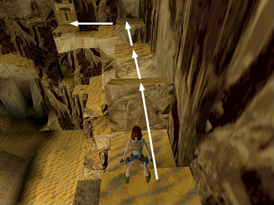 Then turn around and make your way back along that same ledge to the spot where you just pulled up. Vault onto the low ledge to the left and then jump the gap to the ledge ahead (the one with a low sandy step above it). From there, take a running jump to the next higher ledge.
