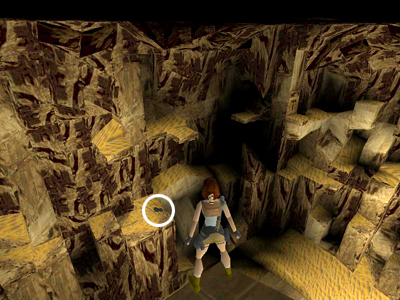 If you use the Look button and rotate Lara's vision, you can catch a glimpse of a dark object against the lighter background of the sandy ledges along the cave wall. This is secret #1, the UZIS, floating on an invisible platform. The guns are circled in these screenshots.