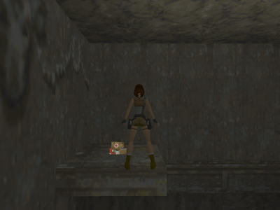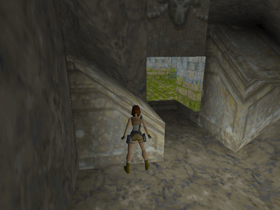 Inside is a small room with a slope that meets the floor, 3 angled blocks and a small ledge above. Position Lara with her back to the slope and her chest against the side of the lowest angled block, as shown above.
