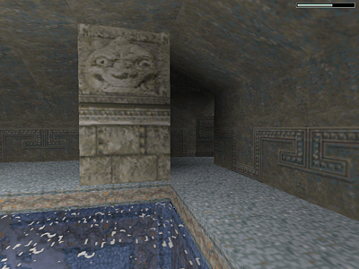 Follow this tunnel forward and down. At the bottom on the left is the tunnel leading up to the pool. If you have only a little air remaining, go that way and surface to breathe. Otherwise continue straight ahead, following the tunnel as it slopes upward. . .